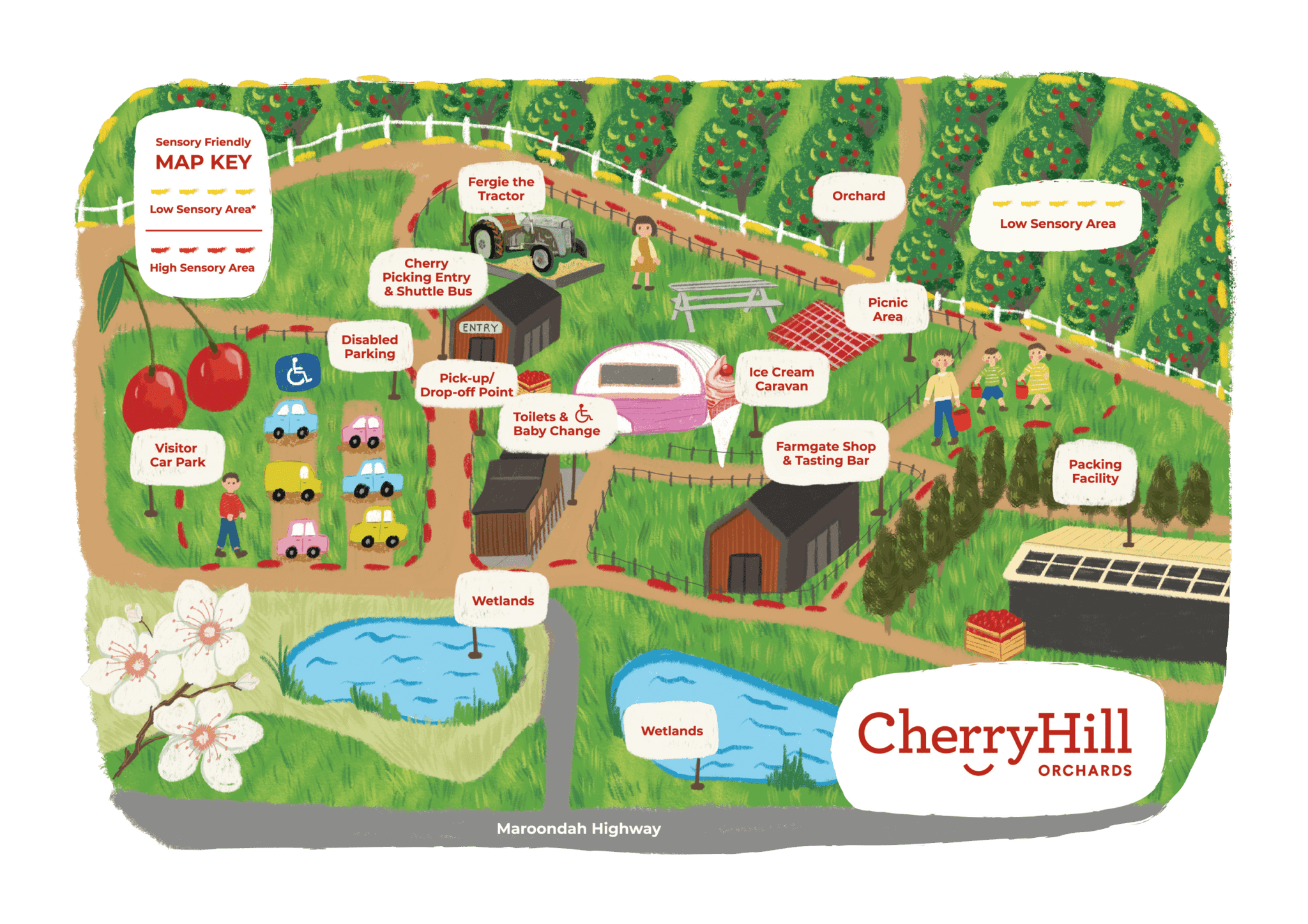 You will find high and low sensory areas marked on our maps to assist guests with sensory needs to navigate our orchards comfortably. We recommend guests with sensory needs to visit us during the week, as our orchards are less congested and a lot more peaceful during these times. Weekend and public holidays are exceptionally busy periods. There are quiet areas throughout the orchard people can access, just ask a member of our friendly team for assistance.